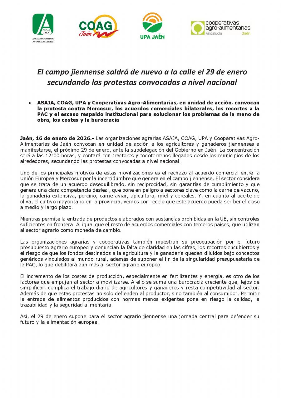 Adjunto se remite nota de prensa emitida por Cooperativas Agro-alimentarias de Jaén junto a las organizaciones Agrarias Asaja, Coag y Upa, por la que se convoca, en defensa del presente y futuro del sector agroalimentario, a una manifestación el próximo día 29 de enero, jueves, a las 12:00h, ante la Subdelegación del Gobierno de Jaén; secundando además a las...