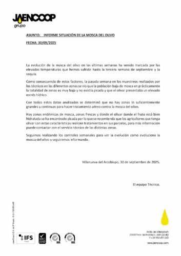 Hay zonas endémicas de mosca, zonas frescas y donde el olivar donde el fruto está bien hidratada se ha encontrado picada por lo que se recomienda que los agricultores que tenga olivar con estas características realicen tratamientos en sus parcelas, para más información puede contactar con el servicio técnico de las distintas zonas.