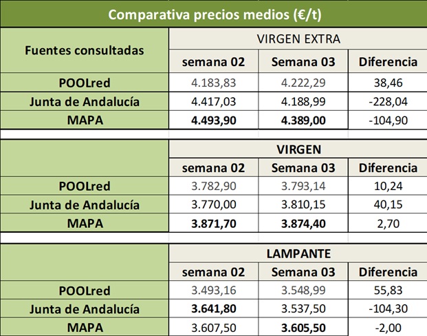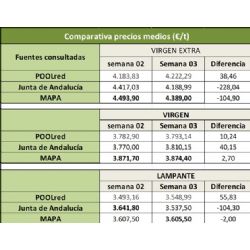 Adjuntamos informe con la evolución semanal de precios en origen del Aceite de Oliva en sus distintas categorías, contrastando las fuentes de información disponibles, correspondientes a la semana 03 de 2026 (del 12 al 18 de enero) y anteriores.