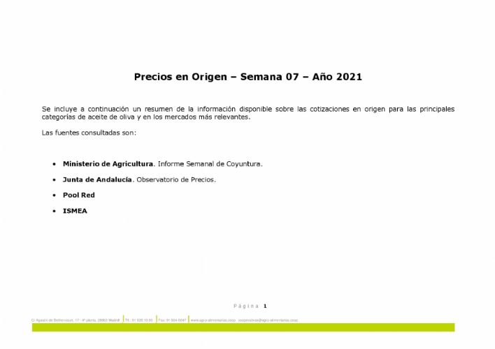 Adjuntamos un nuevo informe con la evolución semanal de precios en origen del Aceite de Oliva en sus distintas categorías, en esta ocasión correspondientes a la semana 07 de 2021 (15 - 21 de febrero), en la que se mantiene su tendencia positiva.