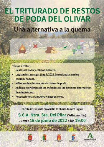 El próximo Jueves 16 de Junio a las 19:00 h . tendrá lugar la charla 'EL TRITURADO DE RESTOS DE PODA DEL OLIVAR. Una alternativa a la quema.'