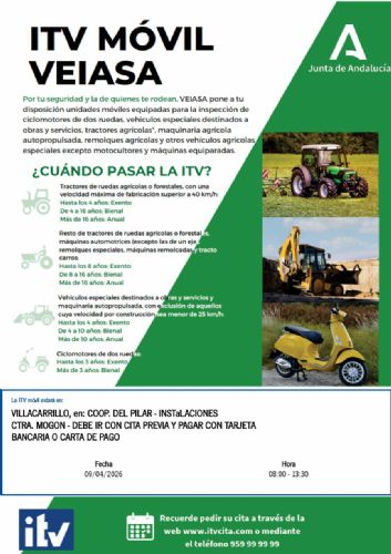 El próximo día 9 de Julio en horario 8:00 a 13:30 estará en nuestras instalaciones la ITV móvil. DEBE VENIR CON CITA PREVIA Y PAGAR CON TARJETA BANCARIA O CARTA DE PAGO. Se puede solicitar cita previa a través de la web www.itvcita.com o al teléfono 959 99 99 99.
